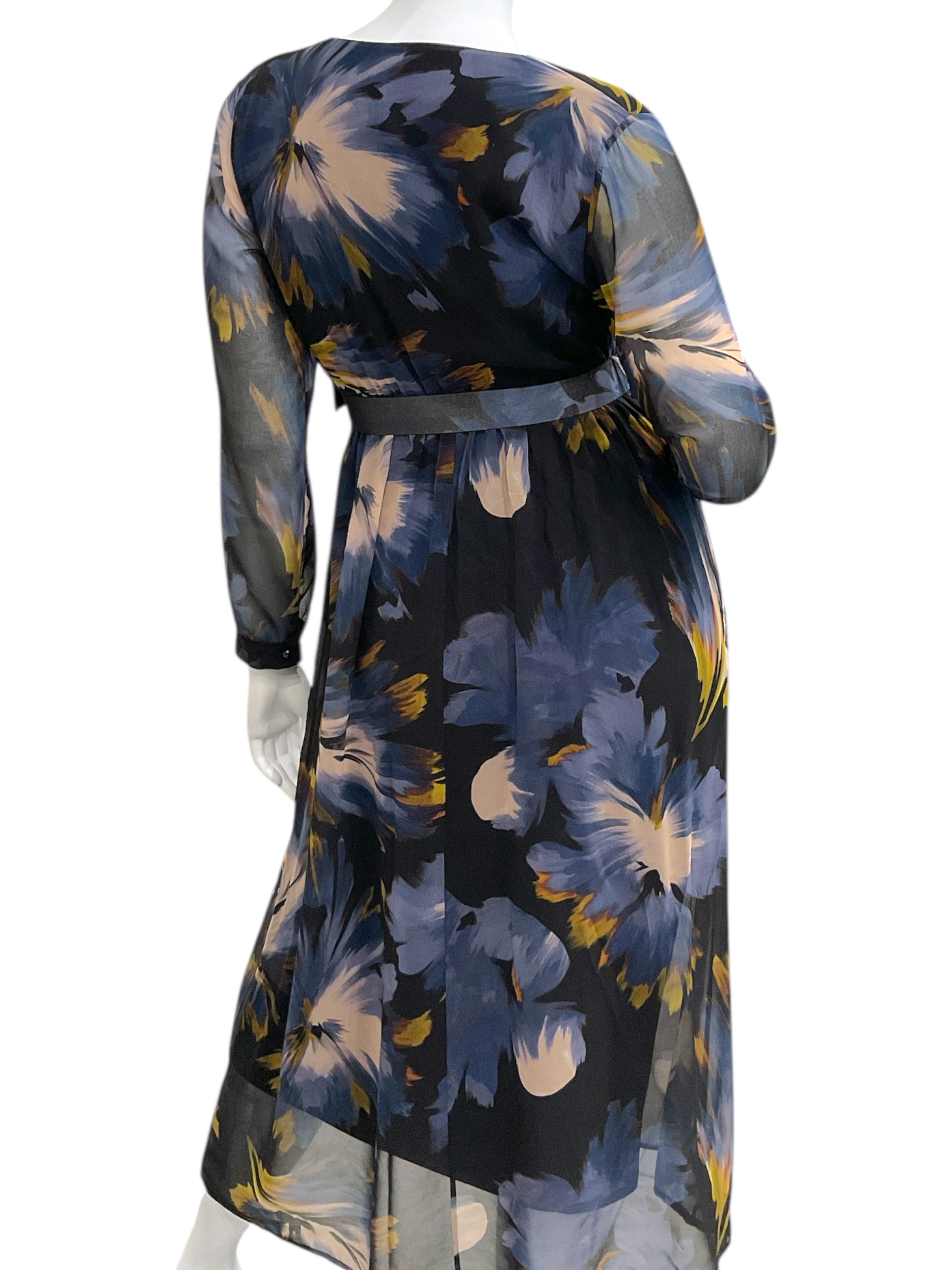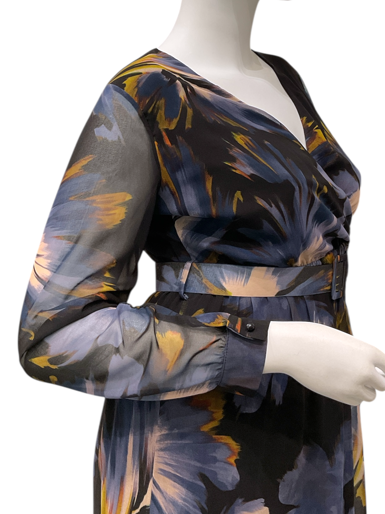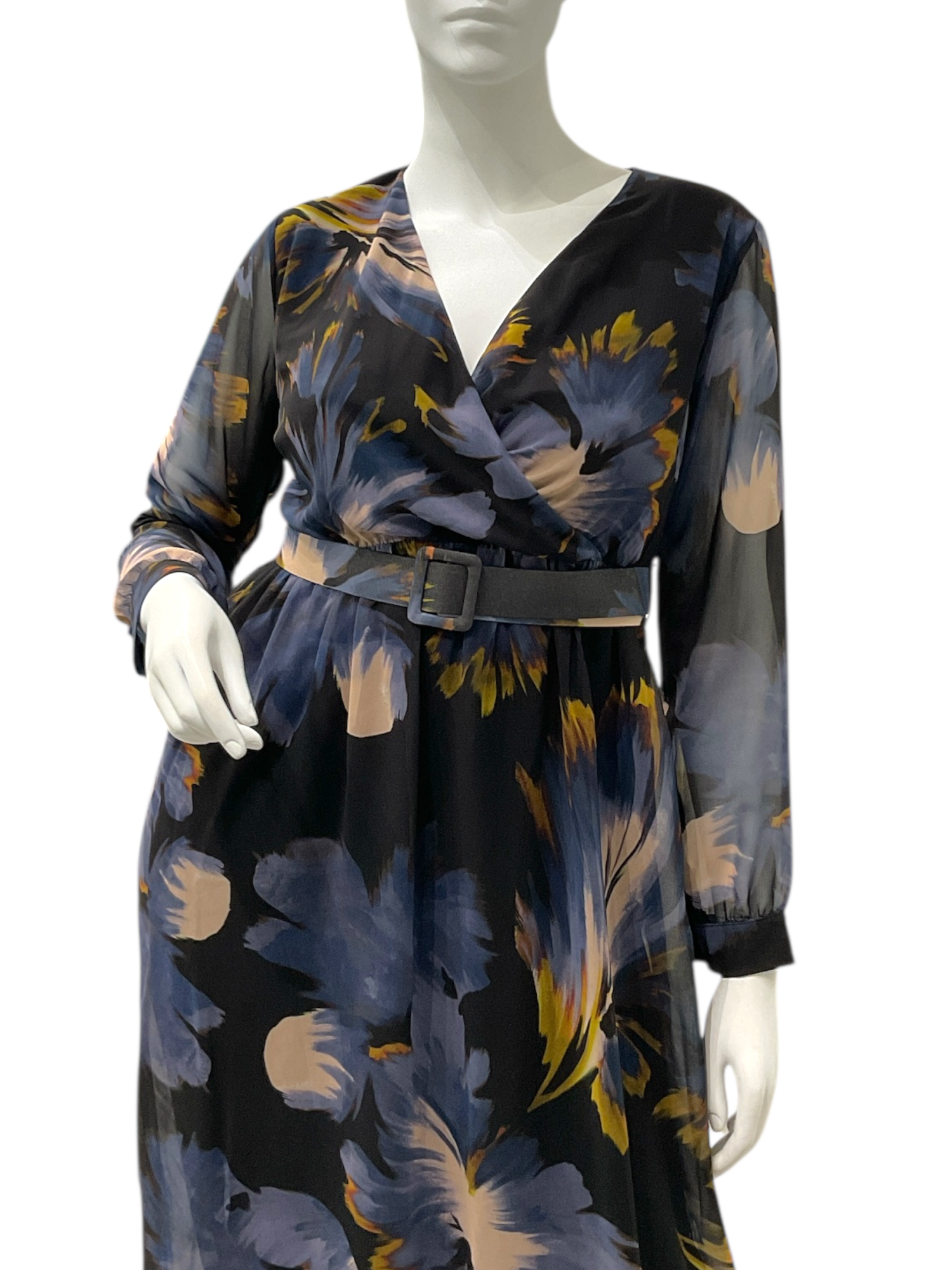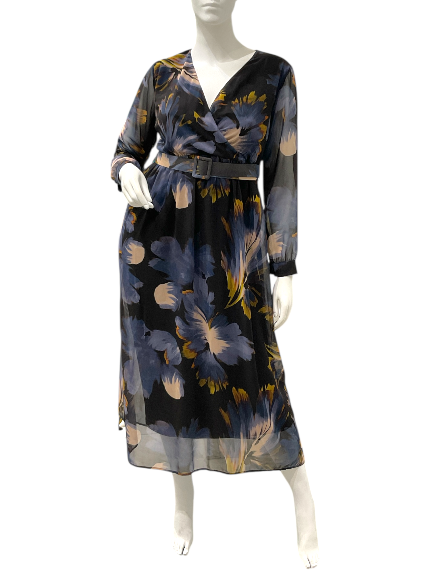 Abito lungo a fantasia, modello incrociato con cinturone