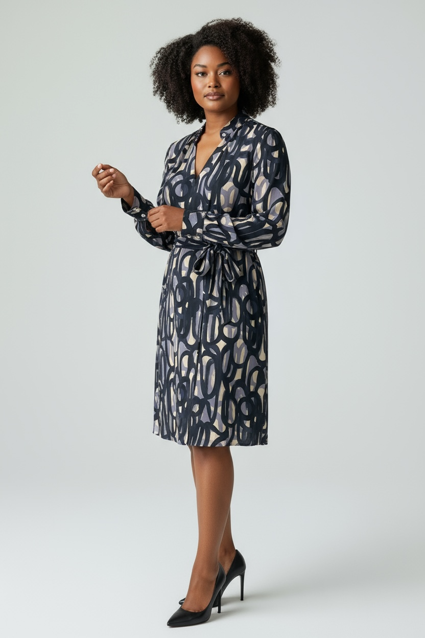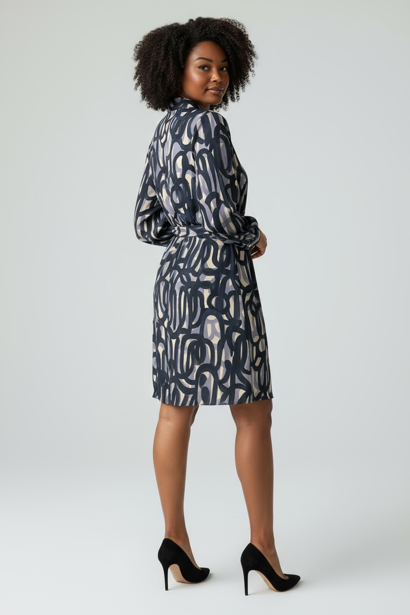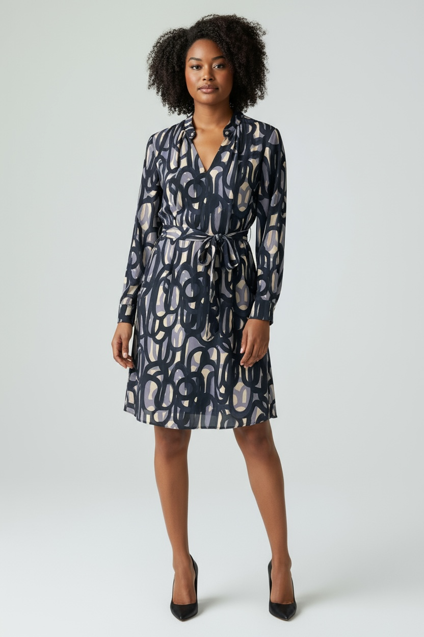 Abitino a fantasia con cintura in stoffa, scollo a V con dettaglio gioiello