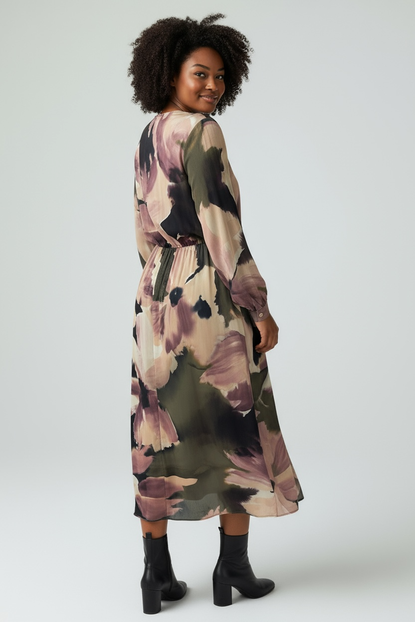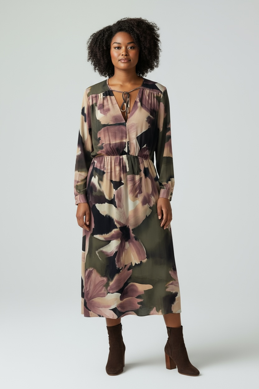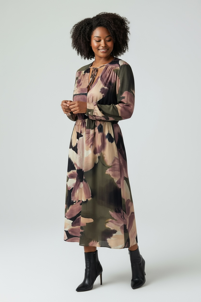 Abito lungo a fantasia, scollo a V con fiocchetto