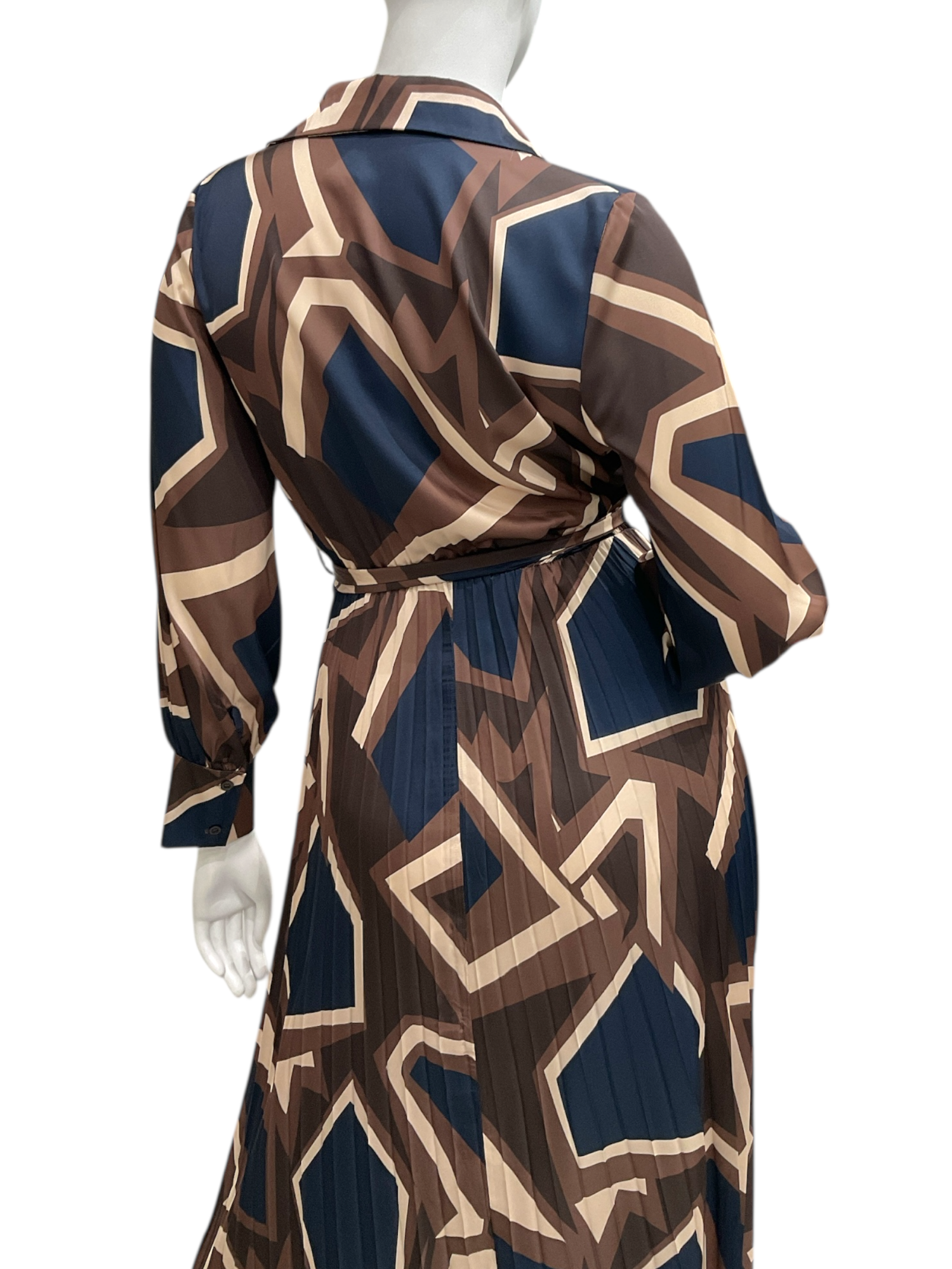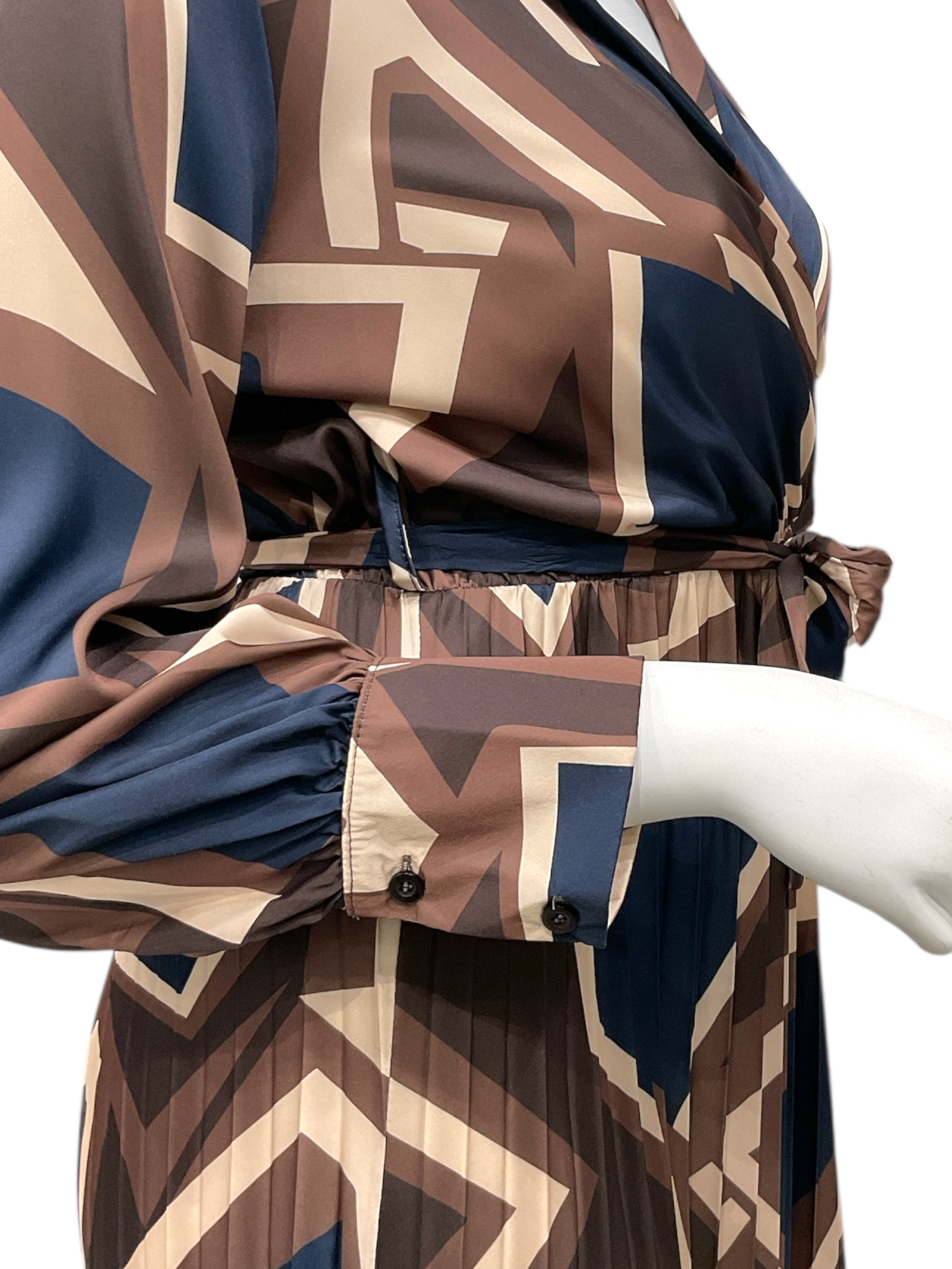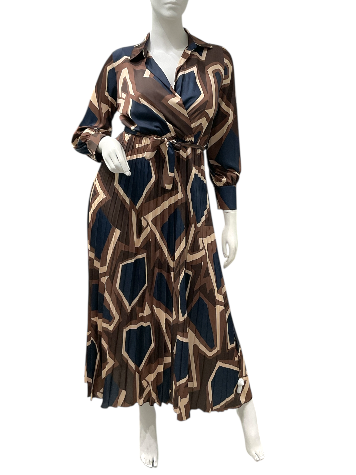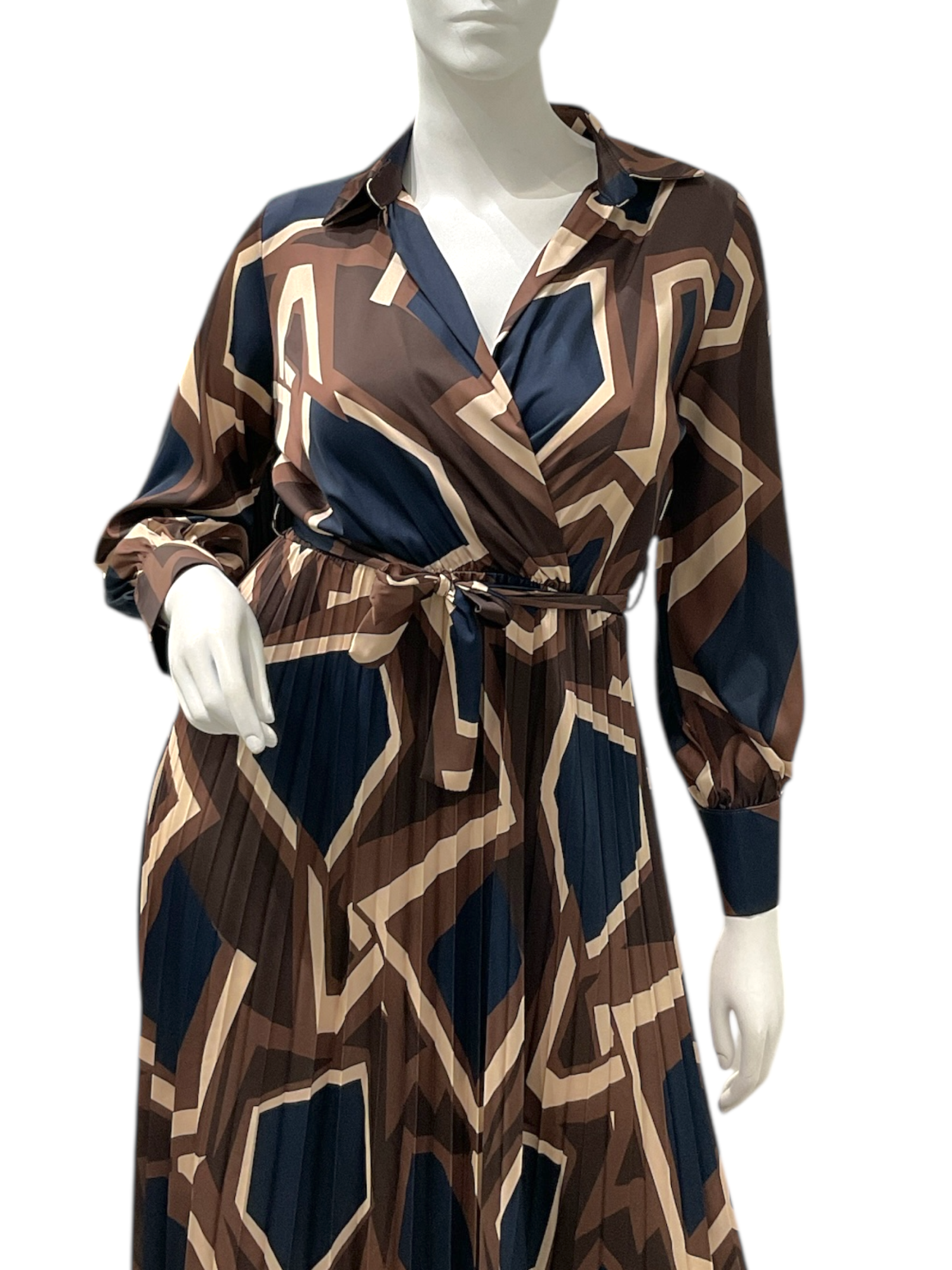 Abito lungo a fantasia, modello incrociato con gonna plissettata