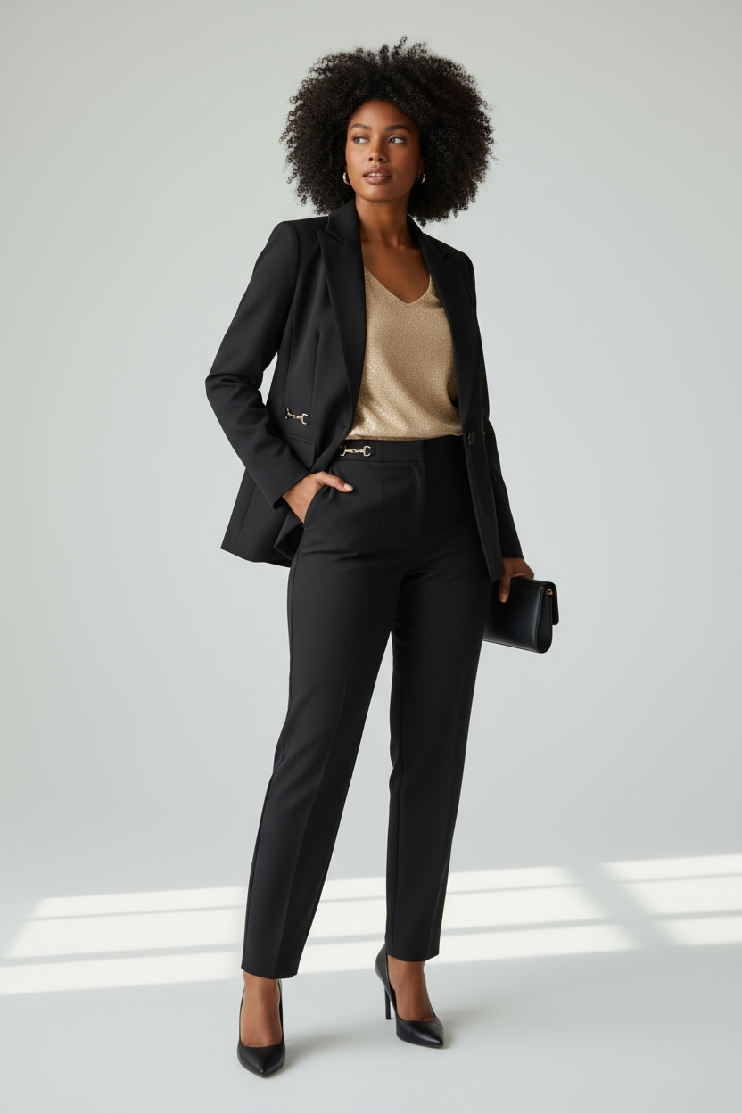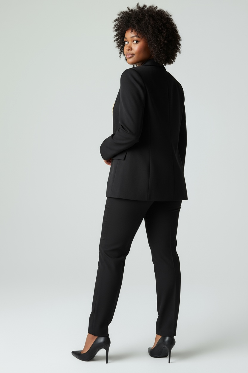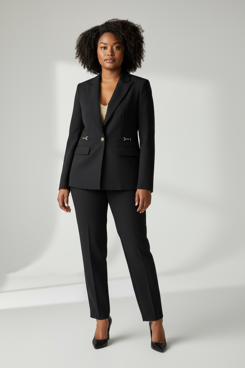 Giacca 1 bottone, dettaglio fibbiette laterali, finte tasche con pattine