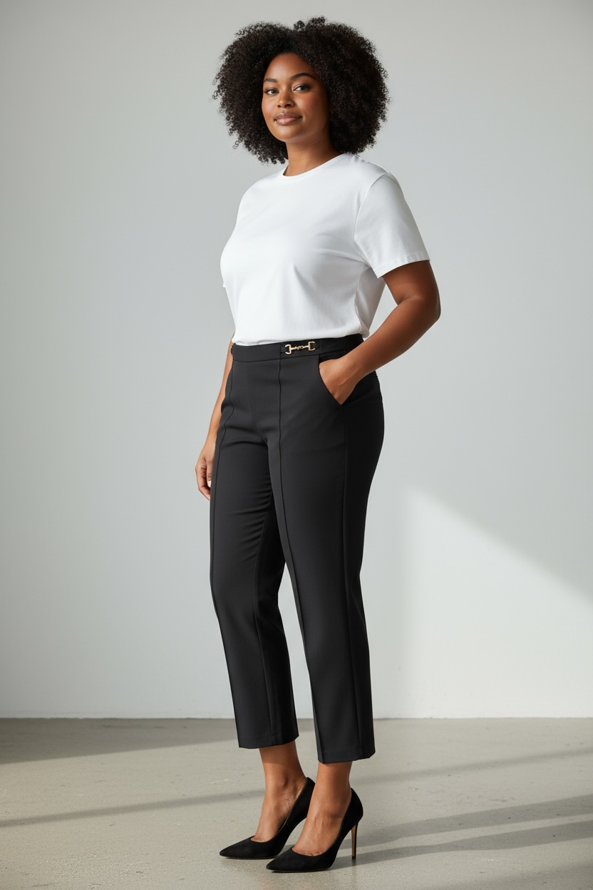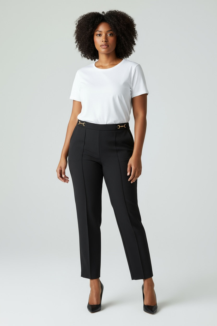 Pantalone ripresa avanti, con tasche e dettaglio fibbietta laterale